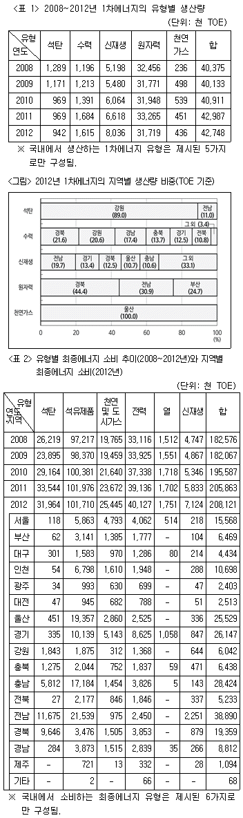 다음 <표>와 <그림>은 우리나라의 에너지 유형별 1차에너지 생산과 최종에너지 소비에 관한 자료이다. 이에 대한 <보기>의 설명으로 옳지 않은 것은?
