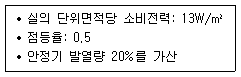 다음과 같은 조건에서 교실면적이 480m2인 경우 조명기구(형광등)로부터의 취득열량은?
