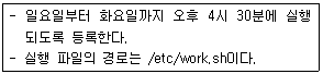 다음과 같은 조건으로 cron을 이용해서 일정을 등록할 때 알맞은 것은?
