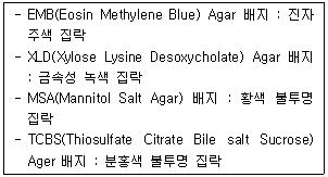 여러 가지 선택배지를 이용하여 미생물 검사를 하였더니 다음과 같은 결과가 나왔다. 다음 중 검출 양성이 예상되는 미생물은?