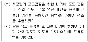 아래의 (ㄱ)과 (ㄴ)의 반응에서 나타나는 색을 순서대로 나열한 것은?