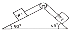 그림에서 W1과 W2가 어느 한쪽도 내려가지 않게 하기 위한 W1 : W2의 크기의 비는 어느 것인가? (단, 경사면의 마찰은 무시한다.)