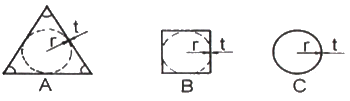 그림과 같이 두께가 얇은 파능로 된 원(반경 : r)과 이에 외접하는 정3각형 및 정4각형 모양의 단면을 갖는 부재가 있다. 비강도가 작은 것부터 큰 순서로 배열된 것은? (단, 두께 t는 동일하며, 국부적인 응력집중은 무시한다.)