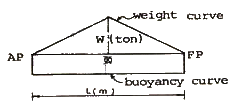 그림과 같은 중량곡선과 부력곡선을 가진 선박에서 최대굽힘모멘트가 발생하는 곳과 그 값을 옳게 나타낸 것은?