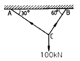 그림과 같이 강선이 천정에 매달려 100kN의 무게를 지탱하고 있을 때, AC 강선이 받고 있는 힘은 약 몇 kN 인가?