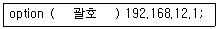 다음은 dhcpd.conf에서 게이트웨이 주소를 지정하는 항목이다. ( 괄호 ) 안에 들어갈 내용으로 알맞은 것은?