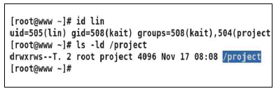 다음 그림의 결과에서 lin 사용자가 /project 디렉터리에 파일을 생성했을 경우에 해당 파일의 그룹 소유권과 관련된 설명으로 알맞은 것은?