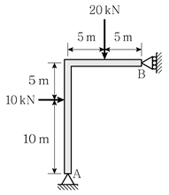 그림과 같은 구조물에서 지점 B의 수평반력[kN]의 크기와 방향은? (단, 구조물의 자중은 무시한다)