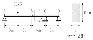 그림과 같이 게르버보에 10kN의 집중하중이 작용할 때, 허용전단응력을 고려한 b의 최솟값[m]은? (단, 보의 허용전단응력은 300kPa이며, 보의 자중은 무시한다)