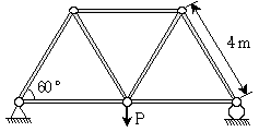 그림과 같이 각 부재의 길이가 4m, 단면적이 0.1m2인 트러스 구조물에 작용할 수 있는 하중 P[kN]의 최댓값은? (단, 부재의 좌굴강도는 6kN, 항복강도는 100kN/m2이다)