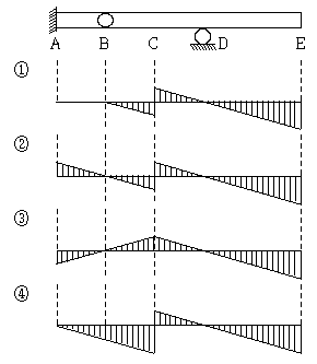 그림과 같이 B점에 내부힌지가 있는 게르버 보에서 C점의 전단력의 영향선 형태로 가장 적합한 것은?