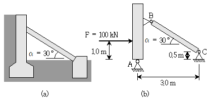 그림 (a)와 같이 30° 각도로 설치된 레이커로 지지된 옹벽을 그림 (b)와 같이 모사하였다. 옹벽에 작용하는 토압의 합력이 그림 (b)와 같이 하부의 지지점 A로부터 1m 높이에 F=100kN일 때, 레이커 BC에 작용하는 압축력[kN]은? (단, 옹벽 및 레이커의 자중은 무시한다)