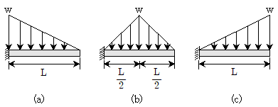 그림과 같이 동일한 길이의 캔틸레버 보 (a), (b), (c)에 각각 그림과 같은 분포하중이 작용하였을 때, 캔틸레버 보 (a), (b), (c)의 고정단에 작용하는 휨모멘트 크기의 비율은? (단, 캔틸레버 보의 자중은 무시한다)