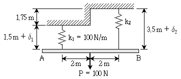 그림과 같이 두 스프링에 매달린 강성이 매우 큰 봉(bar) AB의 중간 지점에 하중 100N을 작용시켰더니 봉이 수평이 되었다. 이때 스프링의 강성 k2[N/m]는? (단, k1, k2는 스프링의 강성이며, 봉과 스프링의 자중은 무시한다)