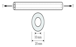 그림과 같이 외경이 20mm, 내경이 10mm인 원형 강봉이 비틀림모멘트 T를 받을 때, 강봉에 발생하는 최대전단응력(τmax)과 최소전단응력(τmin)의 비(