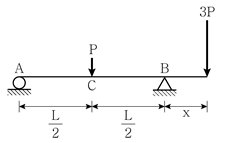 그림과 같은 내민보에서 C점의 휨모멘트가 0이 되는 길이 x는? (단, 자중은 무시한다)