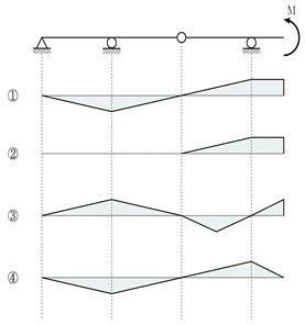 그림과 같이 내부힌지가 있는 보에 대한 정성적인 휨모멘트도로 옳은 것은? (단, 자중은 무시한다)