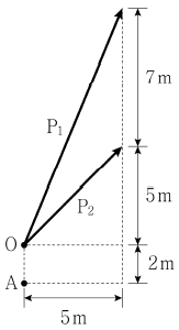 그림과 같이 P1=13kN, P2=7√2kN의 힘이 O점에 작용할 때, A점에 대한 모멘트의 크기[kN⋅m]는?