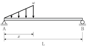그림과 같이 길이가 L인 단순보에 삼각형 분포하중이 작용하고 있다. A점과 B점의 수직반력이 같다면, 삼각형 분포하중이 작용하는 거리 x는? (단, 구조물의 자중은 무시한다)