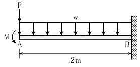 그림과 같이 캔틸레버보에 집중하중(P), 등분포하중(w), 모멘트하중(M)이 작용하고 있다. 자유단 A에 최대 수직처짐을 발생시키는 하중은 이 세 가지 중 어느 것이며, 보에 세 하중이 동시에 작용할 때 발생하는 수직처짐 의 크기[mm]는? (단, P=10kN, w=10kN/m, M=10kNㆍm, 휨강성 EI=2×1010kNㆍmm2이고, 자중은 무시한다)
