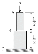 그림과 같이 재료와 길이가 동일하고 단면적이 다른 수직 부재가 축하중 P를 받고 있을 때, A점에서 발생하는 변위는 B점에서 발생하는 변위의 몇 배인가? (단, 구간 AB와 BC의 축강성은 각각 EA와 2EA이고, 부재의 자중은 무시한다)