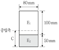 그림과 같이 두 개의 재료로 이루어진 합성 단면이 있다. 단면 하단으로부터 중립축까지의 거리 C[mm]는? (단, 각각 재료의 탄성계수는 E1=0.8×105MPa, E2=3.2×105MPa이다)