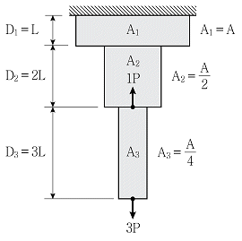 그림과 같은 부재에 2개의 축하중이 작용할 때 구간 D1, D2, D3의 변위의 비(δ1:δ2:δ3)는? (단, 모든 부재의 단면적은 A로 나타내며, 탄성계수 E는 일정하고, 자중은 무시한다)
