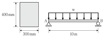 그림과 같이 폭 300mm, 높이 400mm의 직사각형 단면을 갖는 단순보의 허용 휨응력이 6MPa이라면, 단순보에 작용시킬 수 있는 최대 등분포하중 w의 크기[kN/m]는? (단, 보의 휨강성 EI는 일정하고, 자중은 무시한다)