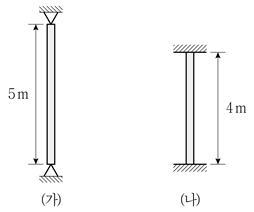 그림 (가)와 같은 양단이 핀 지지된 길이 5m 기둥의 오일러 좌굴하중(Pcr)의 크기가 160kN일 때, 그림 (나)와 같은 양단 고정된 길이 4m 기둥의 오일러 좌굴하중의 크기[kN]는? (단, 두 기둥의 단면은 동일하고, 탄성계수는 같으며, 구조물의 자중은 무시한다)