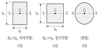 그림과 같은 단면적이 동일한 3개의 단면에 대하여 도심축(X축)에 대한 단면2차모멘트의 크기 순서로 옳게 표현된 것은?