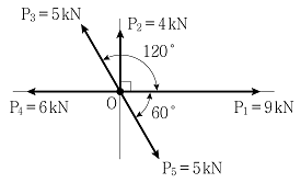 그림과 같이 O점에 작용하는 힘의 합력의 크기[kN]는?
