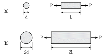 그림 (a), 그림 (b)와 같이 원형단면을 가지고 인장하중 P를 받는 부재의 인장변형률이 각각 εa와 εb일 때, 인장변형률 εa에 대한 인장변형률 εb의 비 εb/εa는? (단, 그림 (a) 부재와 그림 (b) 부재의 길이는 각각 L과 2L, 지름은 각각 d와 2d이고, 두 부재는 동일한 재료로 만들어졌으며, 구조물의 자중은 무시한다)