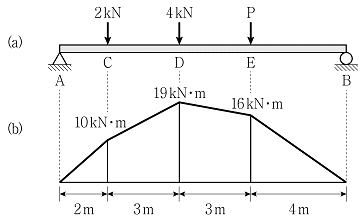 그림 (a)와 같이 하중을 받는 단순보의 휨모멘트선도가 그림 (b)와 같을 때, E점에 작용하는 하중 P의 크기[kN]는? (단, 구조물의 자중은 무시한다)