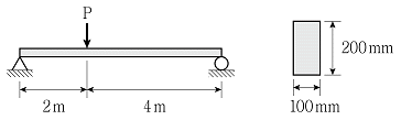 그림과 같이 폭 100mm, 높이가 200mm의 직사각형 단면을 갖는 단순보의 허용 휨응력이 6MPa이라면, 단순보에 작용시킬 수 있는 최대 집중하중 P의 크기[kN]는? (단, 휨강성 EI는 일정하고, 구조물의 자중은 무시한다)