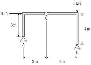 그림과 같이 C점에 내부힌지를 가지는 구조물의 지점 B에서 수직반력의 크기[kN]는? (단, 구조물의 자중은 무시한다)