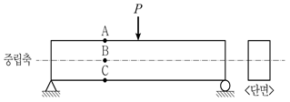 그림과 같이 선형탄성 거동을 하는 직사각형 단면을 가지는 단순보의 중앙에 집중하중이 작용한다면, 보 단면 A, B, C의 위치에서 발생하는 휨응력과 전단응력에 대한 설명으로 옳지 않은 것은? (단, 구조물의 자중은 무시한다)