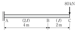그림과 같은 캔틸레버보에서 B점의 처짐각 크기[radian]는? (단, 보의 AB구간 휨강성은 2EI, BC구간 휨강성은 EI이고, 구조물의 자중은 무시한다)