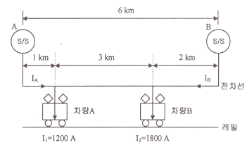 직류 1500V 병렬급전 계통에서 그림과 같은 단위로 차량 부하가 I1(A), I2(A) 로 분포하고 있을 때, B 변전소에서 공급되는 전류 IB(A) 는? (단, 급전선로의 단위 길이 당 저항은 같다.)