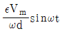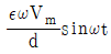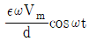 간격 d(m), 면적 S(m2) 의 평행판 전극 사이에 유전율이 ɛ인 유전체가 있다. 전극 간에 v(t) = Vmsinωt의 전압을 가했을 때, 유전체 속의 변위전류밀도 (A/m2) 는?