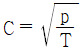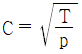 전차선의 장력(N)을 T, 전차선의 단위 길이 질량(kg/m)을 p라 할 때 파동전파속도(m/sec) C는?