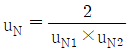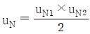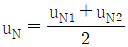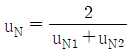 경간 중앙에서의 전차선 편위 값(uN)을 구하는 계산식은? (단, uN1, uN2는 양단 전주에서의 편위 값, 곡선 외측이 +값)