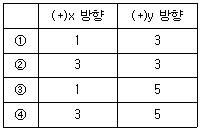 (+)x 방향으로 3kV/m, (+)y 방향으로 5kV/m인 전기장이 있다. 시간 t=0 일 때 원점에 있는 전하 Q=4nC를 띤 질량 m=4mg인 입자가 (+)x 방향으로 4m/s, (+)y 방향으로 10m/s로 움직일 경우 1초 후에 이 입자 가속도의 (+)x 방향 및 (+)y 방향의 값[m/s2]은?