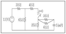 <보기>의 회로에서 스위치가 t=0인 시점에 개방이 된다고 가정한다. t=20ms가 될 때 커패시터의 전압값[V]은? (단, e-1=0.37, e-2=0.14, e-3 =0.05로 한다.)