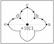 <보기>에서 원점에 위치한 +2C의 점전하가 있다. 주변 공간에 <보기>와 같은 경로를 따라서 -0.5C의 점전하를 a점에서 b점으로 이동시킬 때, 50J의 에너지가 발생한다면, b점에서 c점을 지나 d점으로 +0.5C의 점전하를 이동시킬 때 발생 혹은 입력되는 에너지[J]는? (단, +에너지는 에너지의 발생을, -에너지는 에너지의 입력을 의미하며, 각 지점 및 지점 간 경로는 <보기>의 점선으로 표시된 축을 기준으로 대칭적이다. 더불어서 해당 공간에 자기장은 존재하지 않는다.)