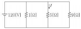 <보기>와 같이 1[Ω], 5[Ω], 9[Ω]의 저항 3개를 병렬로 접속하고 120[V]의 전압을 인가할 때, 5[Ω]의 저항에 흐르는 전류 I[A]는?