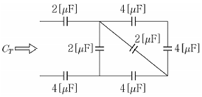 여러 개의 커패시터가 <보기>의 회로와 같이 연결되어있다. 전체 등가용량 CT[μF]은?