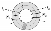 <보기>와 같이 단면적이 S, 평균 길이가 l, 투자율이 μ인 도넛 모양의 원형 철심에 권선수가 N1, N2인 2개의 코일을 감고 각각 I1, I2를 인가했을 때, 두 코일 간의 상호 인덕턴스[H]는? (단, 누설 자속은 없다고 가정한다.)