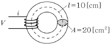 <보기>와 같이 평균길이가 10cm, 단면적이 20cm2, 비투자율이 1,000인 철심에 도선이 100회 감겨있고, 60Hz의 교류전류 2A(실효치)가 흐르고 있을 때, 전압 V의 실효치[V]는? (단, 도선의 저항은 무시하며, μ0는 진공의 투자율이다.)