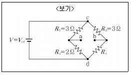 <보기>와 같은 브리지 회로에서 a, b 사이의 전압이 0일 때, R4에서 소모되는 전력이 2[W]라면, c와 d 사이의 전압 Vcd는?