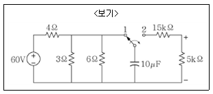 <보기>와 같은 그림에서 스위치가 t=0인 순간 2번 접점으로 이동하였을 경우 t=0+인 시점과 t=∞가 되었을 때, 저항 5[kΩ]에 걸리는 전압을 각각 구한 것은?
